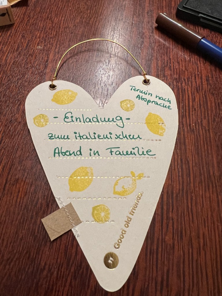 Dann habe ich alle „Zutaten“ in einen schönen Behälter (Tchibo) mit einen passenden Schild zum Thema italienischen Abend arrangiert.