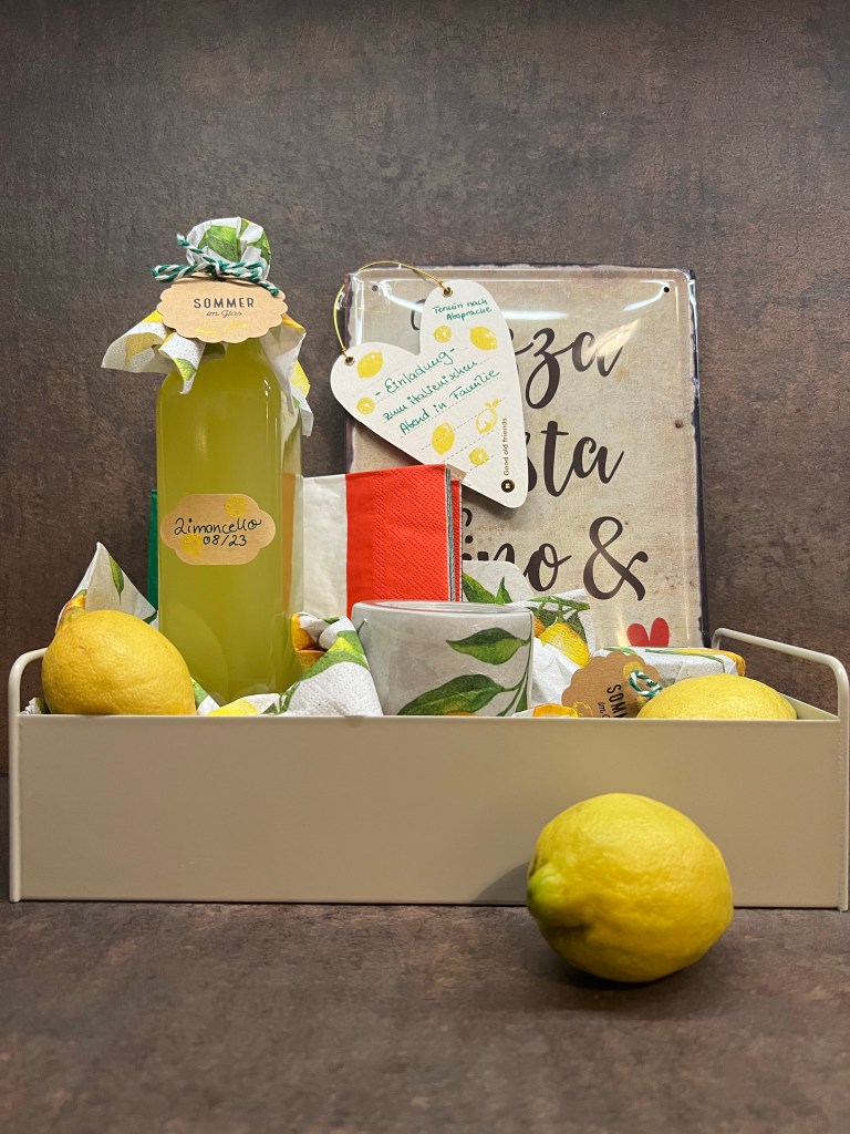 Was schenkt man lieben Personen – gemeinsame Zeit! Wir verschenken einen italienischen Abend in Familie mit selbst gekochten italienischen Spezialitäten. Und das soll schon im Geschenk rüber kommen. Deshalb habe ich für das Geschenk Limoncello selbst gemacht.