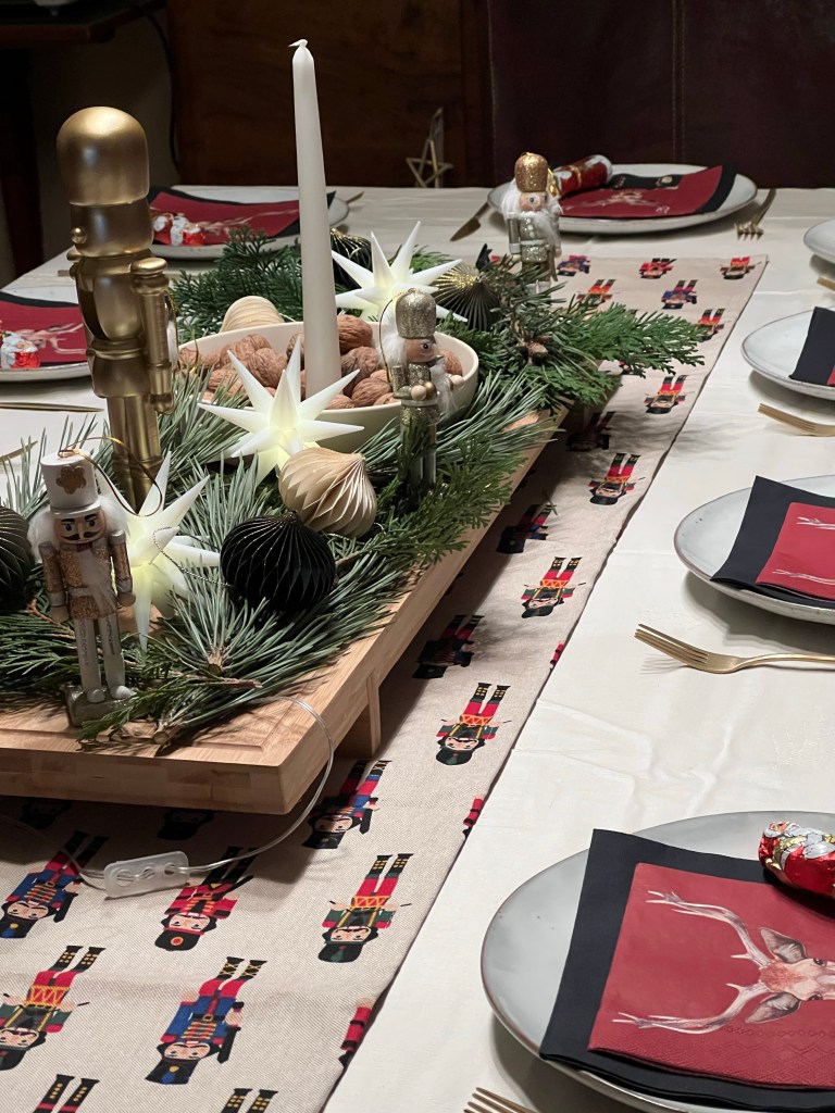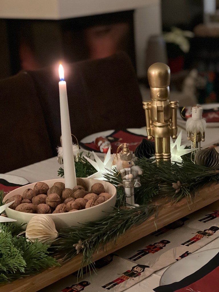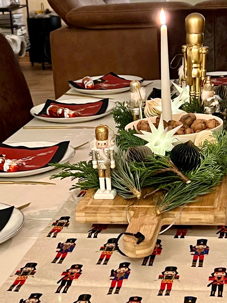 wir haben gestern unser alljährliches vorweihnachtliches Essen mit Freunden gehabt. Für diesen Anlass habe ich unseren Tisch weihnachtlich dekoriert. Und ich dachte, vielleicht ist es ja eine Inspiration für Eure Tischdeko zu Weihnachten. Da man momentan am Nussknacker nicht vorbei kommt, habe ich mir eine Tischdeko mit Nussknackern einfallen lassen.
