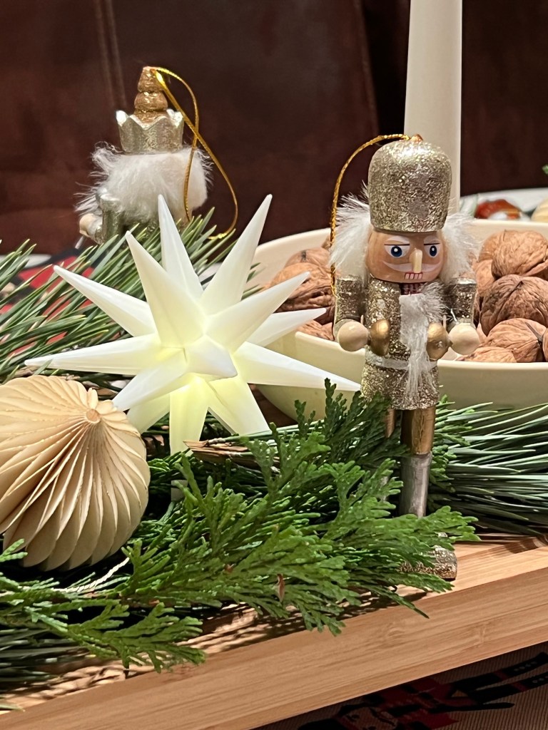 Dann habe ich auf das Brett Kiefer- und Thujazweige gelegt damit man das Kabel von den Sternen nicht mehr sieht. Das Batteriefach habe ich unter dem Brett versteckt. Dazu habe ich ein paar Nussknacker gestellt und ein paar Papierornamente dazu gelegt.