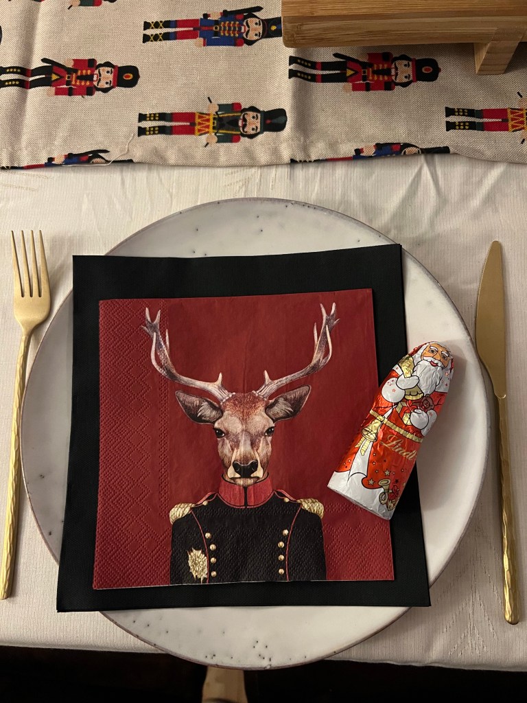 Nun habe ich noch die Servietten dazu gelegt und für jeden einen kleinen Weihnachtsmann als Gastgeschenk.