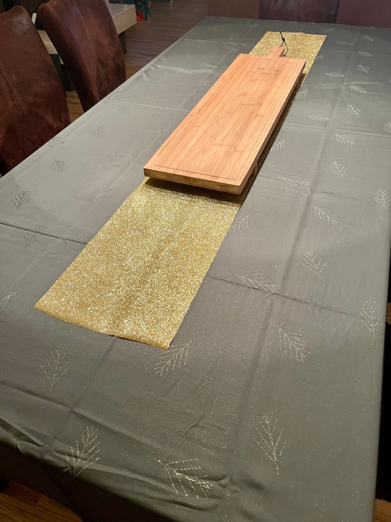 Darauf habe ich einen richtig goldenen Glitzerläufer und mein Lieblingsbrett gelegt.