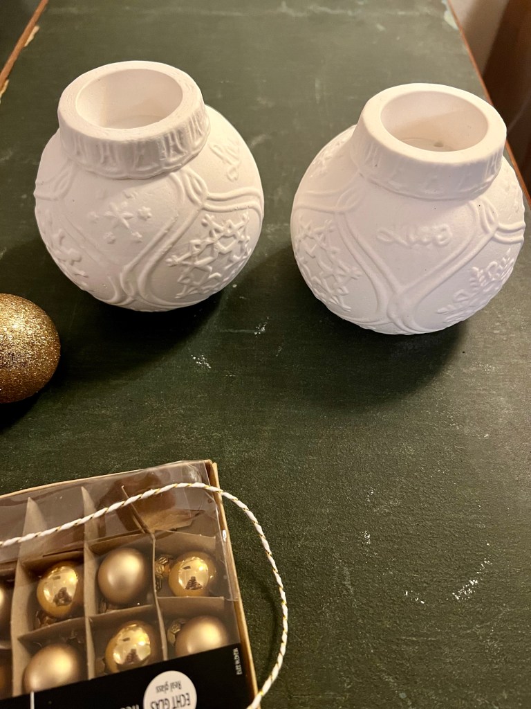 Diese tolle Weihnachtskugel als Kerzenständer für Stabkerzen und Teelichter sowie die kleinen Schneemänner.