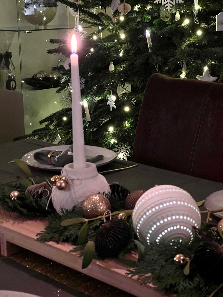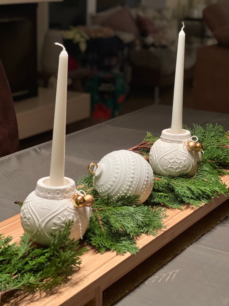 Wer meinen Blog verfolgt, hat bestimmt diese schönen Kerzenständer in Form von Weihnachtskugeln schon entdeckt, die ich vor ein paar Wochen mit Raysin selbst gemacht habe. Heute kommen Sie bei meiner Tischdeko zum Einsatz. Ich habe sie noch mit kleinen goldenen Weihnachtskugeln dekoriert.