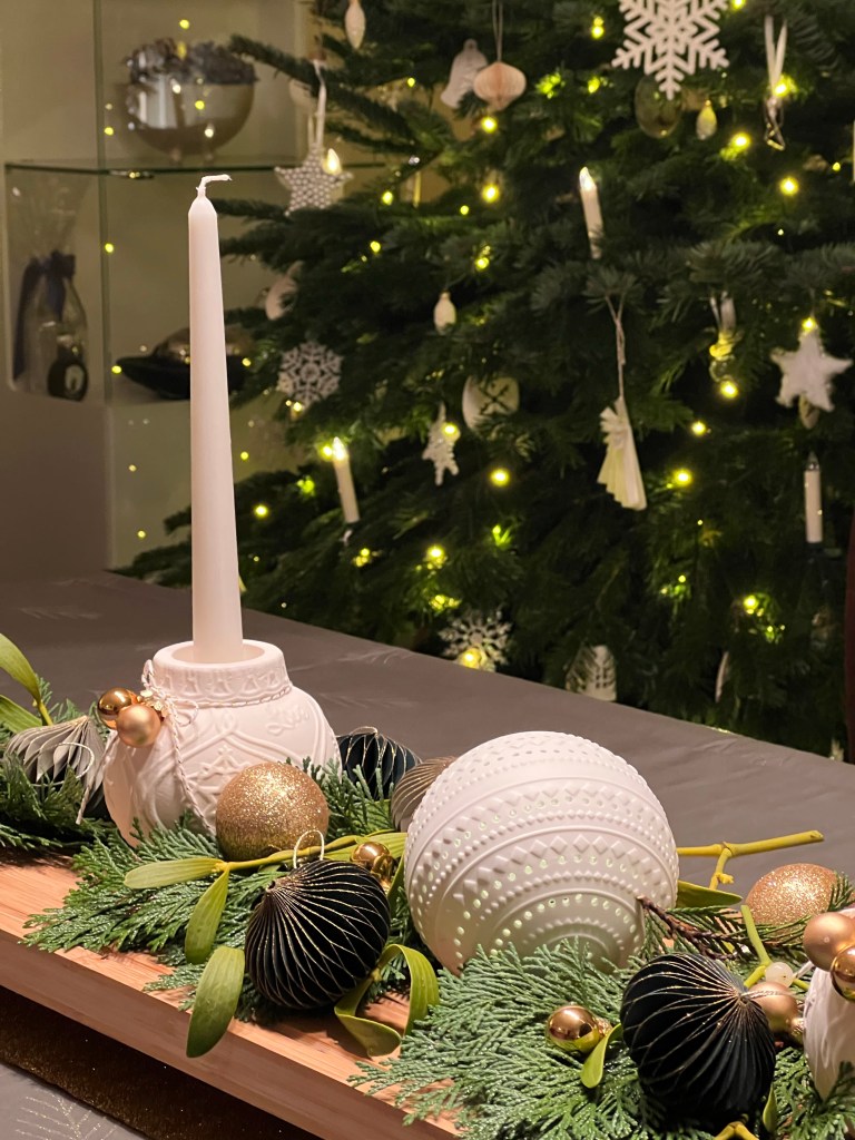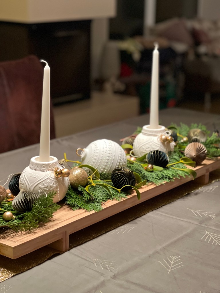 Dann habe ich die Kerzenständer gemeinsam mit einer Lichtweihnachtskugel von Räder auf meinen Brett arrangiert.